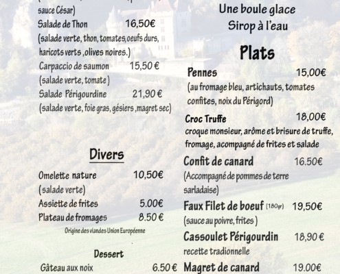 Pour un repas typiquement Périgourdin, notre chef vous propose des plats traditionnels tels que le foie gras de canard, le confit de canard, le magret de canard avec ses pommes de terre Sarladaises et nos glaces maison. Vous pouvez aussi découvrir notre fameux Burger Périgourdin.